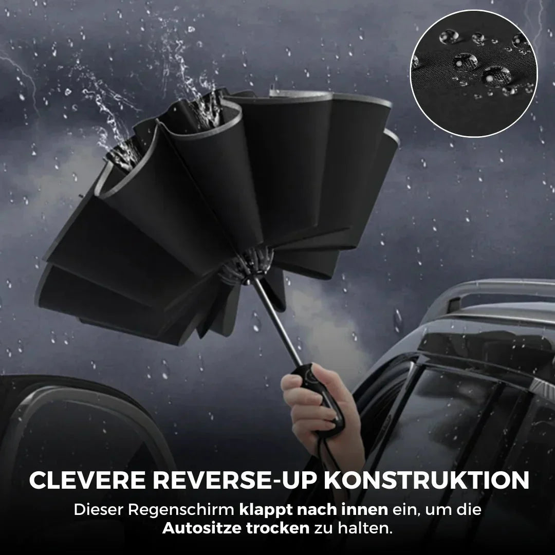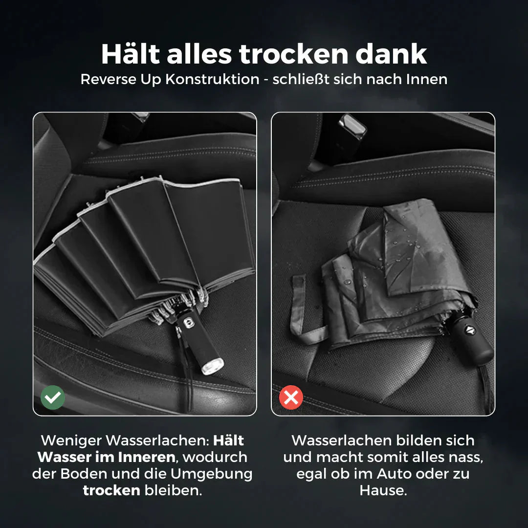 Denn dieser Regenschirm klappt nach innen ein, sodass sich die nasse Oberfläche des Schirms beim Einklappen in der Innenseite befindet und die Autositze trocken bleiben.